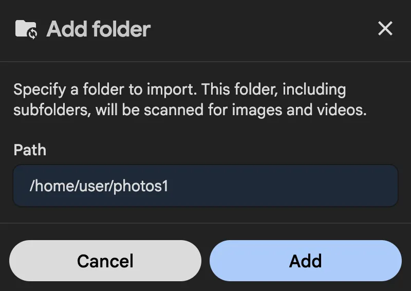 Addin the Folder section to specify a path for scanning and enter /home/user/photos1 as the path and click Add